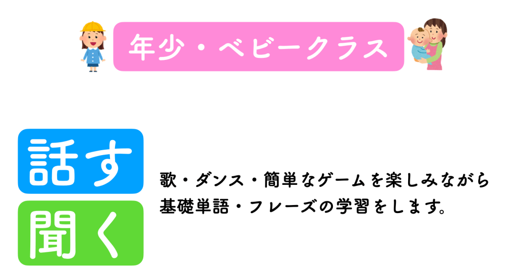 年間行事 1レッスン30分/週1回(年間46回)1クラス最大人数6人(振替生徒含む)レッスン料金/月6,600円(税込)教材費なし※年少・ベビークラスは保護者同伴のレッスンとなります。 共有: X で共有 (新しいウィンドウで開きます) X Facebook で共有 (新しいウィンドウで開きます) Facebook いいね 読み込み中…